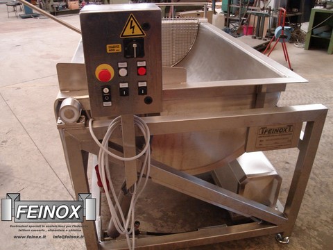 Sistema di inclinazione della vasca durante lo scarico prodotto con centralina oleodinamica elettrica con una centralina oleodinamica elettrica , con pistone incernierato alla vasca stessa per l’ inclinazione della stessa durante lo scarico del prodotto. Dotata di albero centrale con pale del tipo a onda , per l’agitazione del prodotto, con regolazione di velocità posto sul quadro elettrico. L’albero si alza durante la fase di taglio manuale con lira semitonda. N.1 lira di taglio semitonda, a traino manuale , a lame affilate verticali e fili orizzontali , passo quadro .