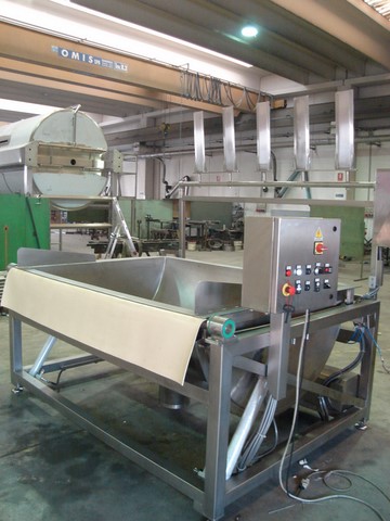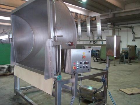 Sistema di inclinazione della vasca durante lo scarico prodotto con centralina oleodinamica elettrica con una centralina oleodinamica elettrica , con pistone incernierato alla vasca stessa per l’ inclinazione della stessa durante lo scarico del prodotto. Dotata di albero centrale con pale del tipo a onda , per l’agitazione del prodotto, con regolazione di velocità posto sul quadro elettrico. L’albero si alza durante la fase di taglio manuale con lira semitonda. N.1 lira di taglio semitonda, a traino manuale , a lame affilate verticali e fili orizzontali , passo quadro .