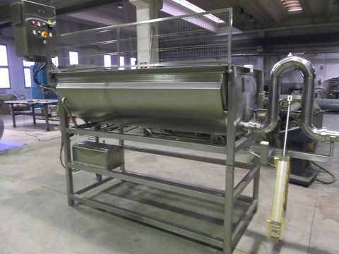 Sistema di inclinazione della vasca durante lo scarico prodotto con centralina oleodinamica elettrica con una centralina oleodinamica elettrica , con pistone incernierato alla vasca stessa per l’ inclinazione della stessa durante lo scarico del prodotto. Dotata di albero centrale con pale del tipo a onda , per l’agitazione del prodotto, con regolazione di velocità posto sul quadro elettrico. L’albero si alza durante la fase di taglio manuale con lira semitonda. N.1 lira di taglio semitonda, a traino manuale , a lame affilate verticali e fili orizzontali , passo quadro .